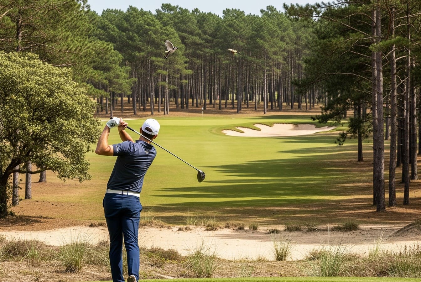 Bermain N ° 15 hidup sesaat ketika lapangan golf menjadi tarian dengan hutan Landes, di bawah tatapan pinus maritim.